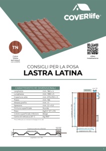 *Prova effettuata con interasse tra fissaggi di mm. 460 TN Colore TERRA NATURALE cod. LLF019TN TC Colore TERRACOTTA cod. LLF019TC sormonti CONSIGLI PER LA POSA LASTRA LATINA CARATTERISTICHE DIMENSIONALI Larghezza Lunghezza Copertura utile Passo Altezza profilo Spessore Finitura superficiale Peso Colore superficiale inferiore Carico di rottura a 20° C mm. 780 ± 5 mm. 1920 ± 5 mm. 670x1830 ± 5 mm. 166 mm. 41 mm. 2,1 ± 0,2 Ruvida Kg/m2 3,7 ± 5% Beige Kg 350* video installazione Lunghezza utile mm. 1830 Lunghezza mm. 1920 mm. 90 mm. 110 mm. 230 Larghezza mm. 780 Larghezza utile mm. 670 mm 41 Copertura utile mm. 670x1830 Larghezza mm. 780 Passo mm. 166 sormonto mm. 110 2