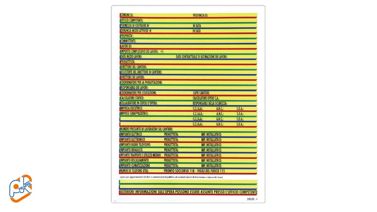 - Colore: Design a colori vivaci per una visibilità ottimale, con sezioni dedicate a informazioni specifiche come il nome del progetto, il responsabile dei lavori e le autorizzazioni